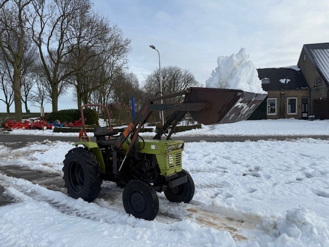 De trekker heeft 27 pk en is voorzien van een degelijke hefinrichting,pto en voorlader.